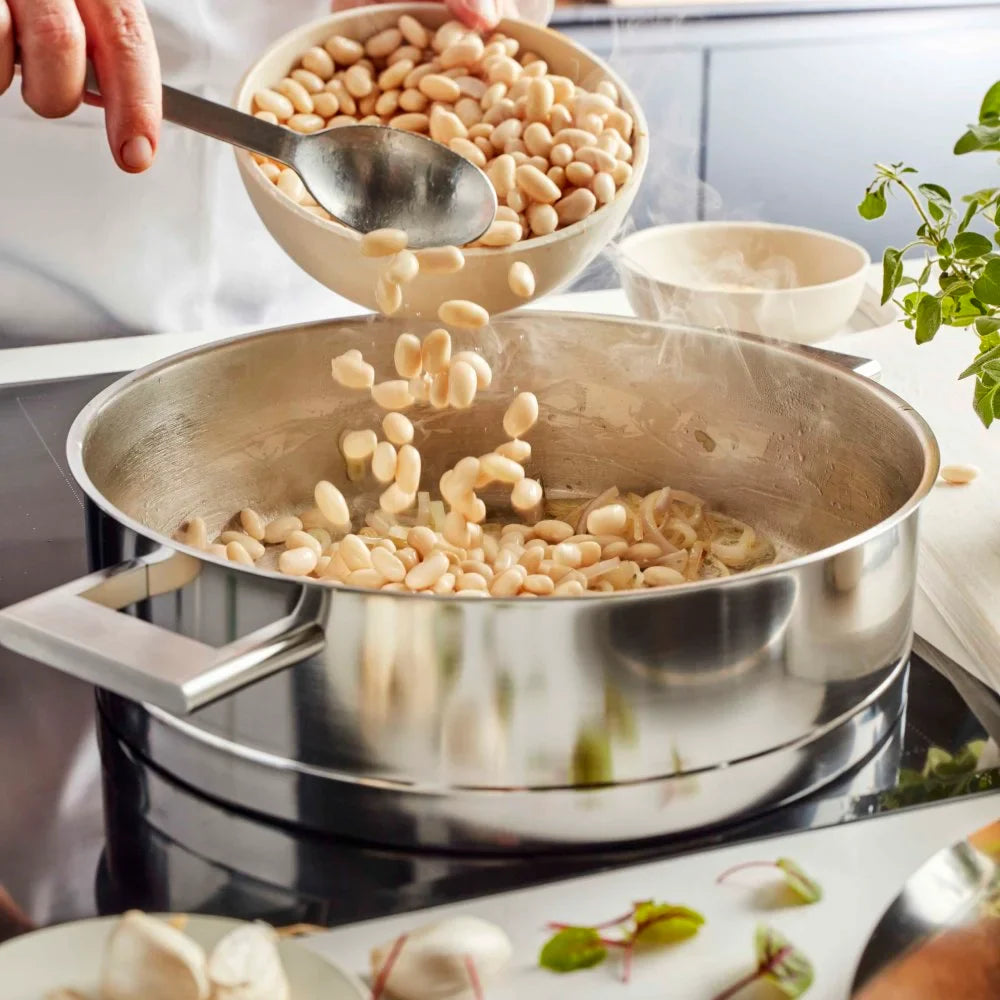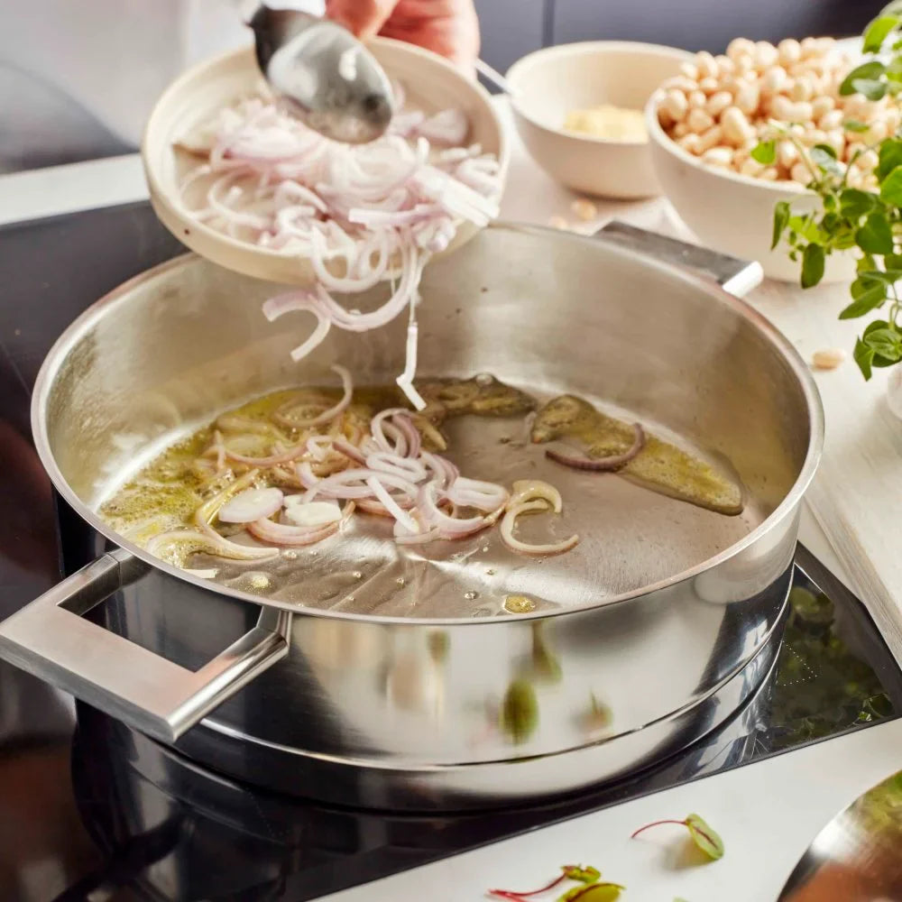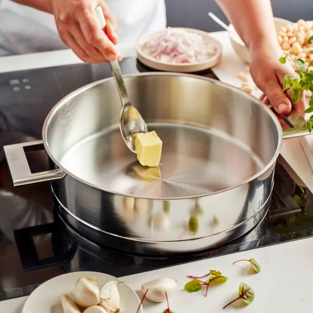 De kookpan is onverslijtbaar en blijft dankzij de Silvinox behandeling levenslang mooi. Dit speciale proces voorkomt verkleuring en maakt schoonmaken eenvoudig. De gelaste grepen liggen stevig in de hand en zorgen voor een hygiënisch ontwerp zonder naden waar vuil kan ophopen. Je kunt de pan gebruiken op alle warmtebronnen, inclusief inductie en oven. Hoewel de pan vaatwasserbestendig is, wordt handwas aanbevolen om de glans en levensduur optimaal te behouden. Met een royale diameter van 28 cm en een lage hoogte is deze pan ook zeer geschikt voor gerechten waarbij regelmatig geroerd moet worden.