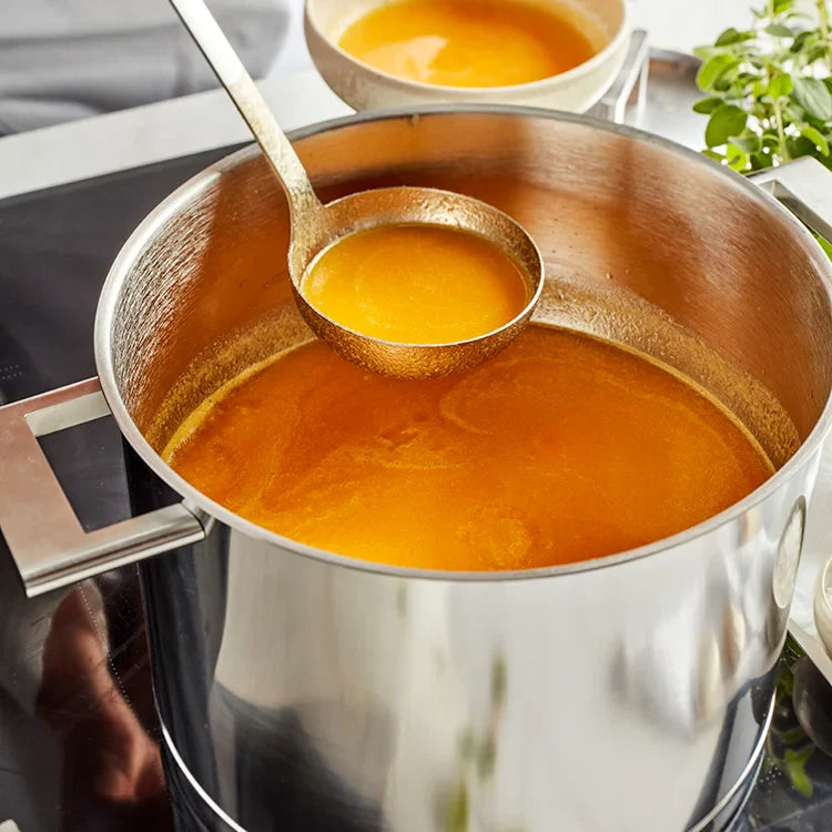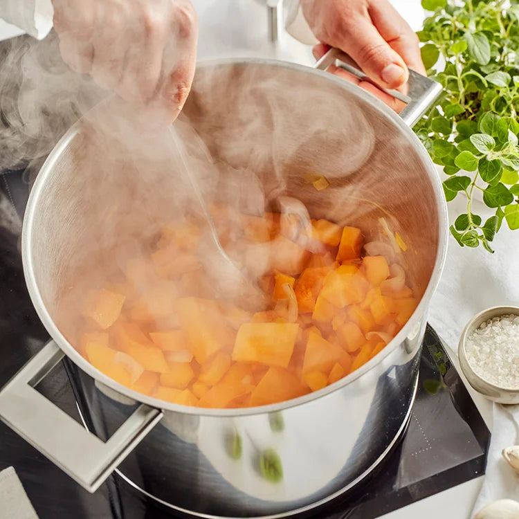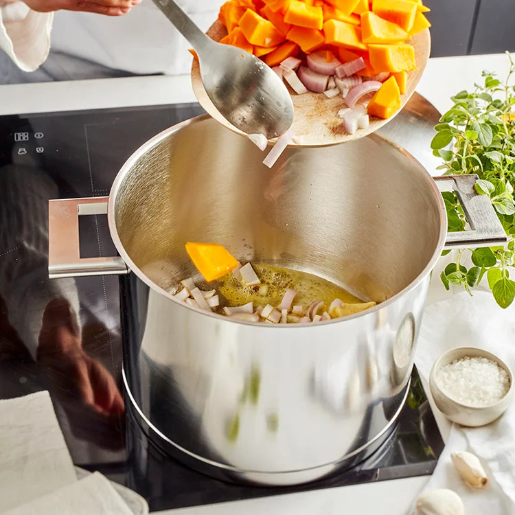 De soeppan is ontworpen voor dagelijks gebruik en blijft levenslang mooi dankzij de Silvinox behandeling. Dit beschermt het roestvrij staal tegen verkleuring en maakt schoonmaken eenvoudig. Hoewel de pan in de vaatwasser kan, wordt handwas aanbevolen om de glans optimaal te bewaren. De gelaste grepen liggen stevig in de hand en hebben geen naden waar vuil kan ophopen, wat zorgt voor extra hygiëne en veiligheid. De soeppan is geschikt voor alle warmtebronnen, inclusief inductie en oven, waardoor je veel vrijheid hebt in je kooktechnieken.