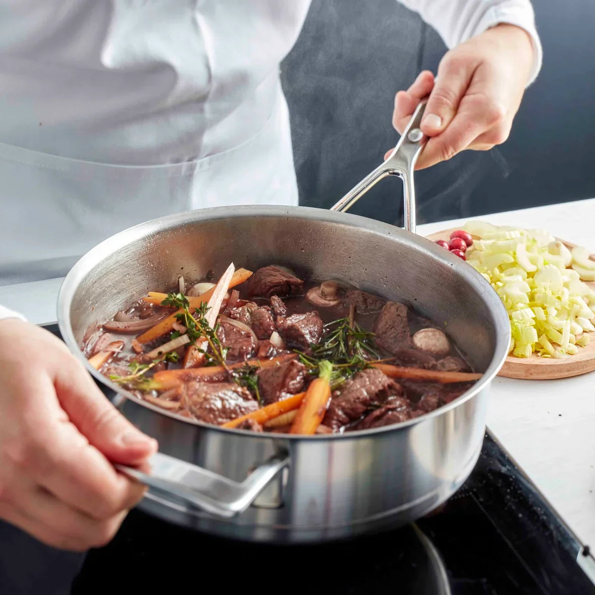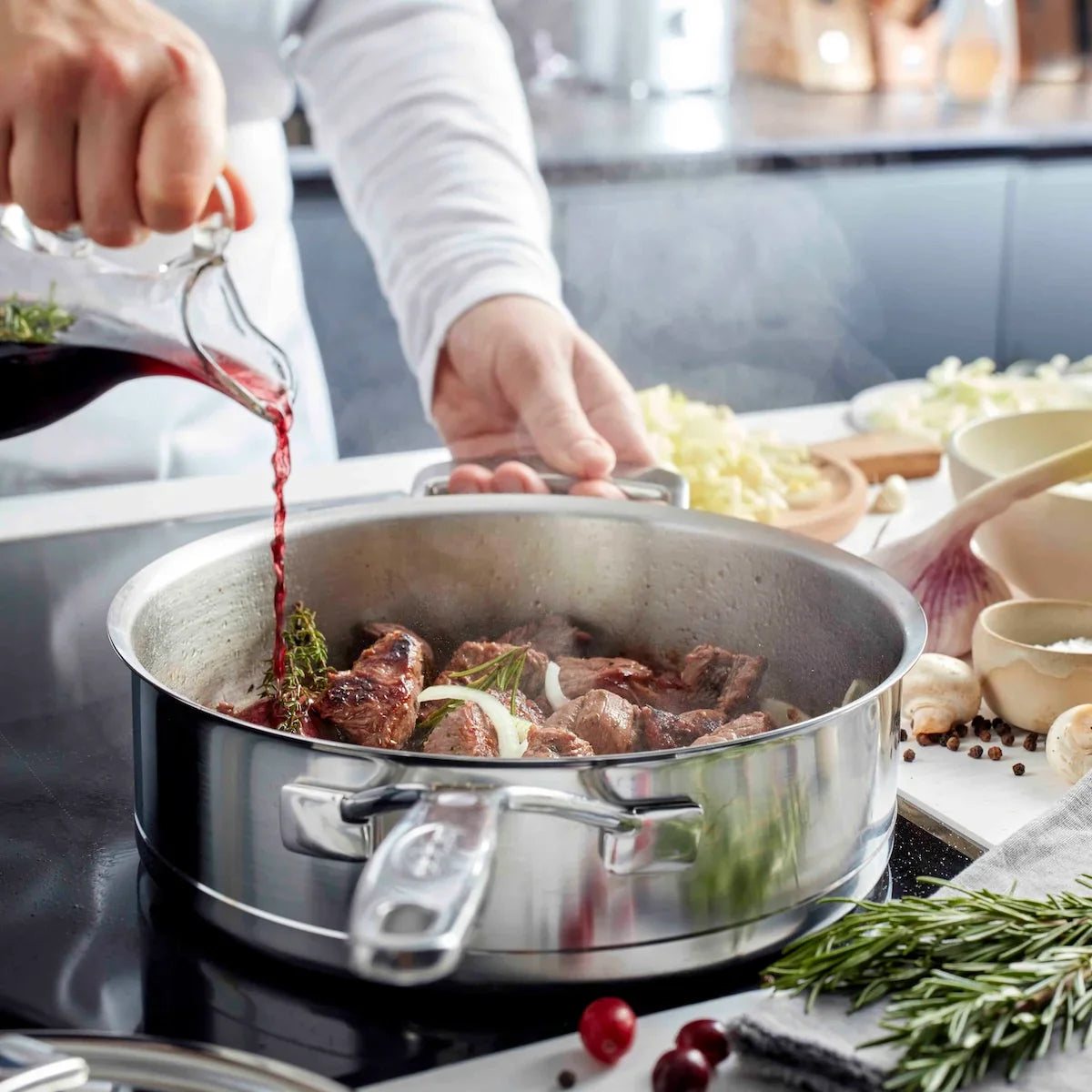 De Demeyere Silver 7 hapjespan is de ideale keuze voor wie op zoek is naar topprestaties in de keuken én een stijlvolle verschijning op het fornuis. Deze lage sauteuse – verkrijgbaar in 24 cm en 28 cm – biedt alles wat je nodig hebt om gerechten zoals gamba’s, kip masala of risotto perfect aan te braden en daarna zachtjes te laten garen. De InductoSeal® bodem met koperen kern zorgt voor een optimale en energiezuinige warmtegeleiding, zelfs bij lage temperaturen. Dankzij het ruime kookoppervlak van 28 cm is deze pan bovendien uitstekend geschikt voor het snel inkoken van sauzen zoals bisque of fonds.